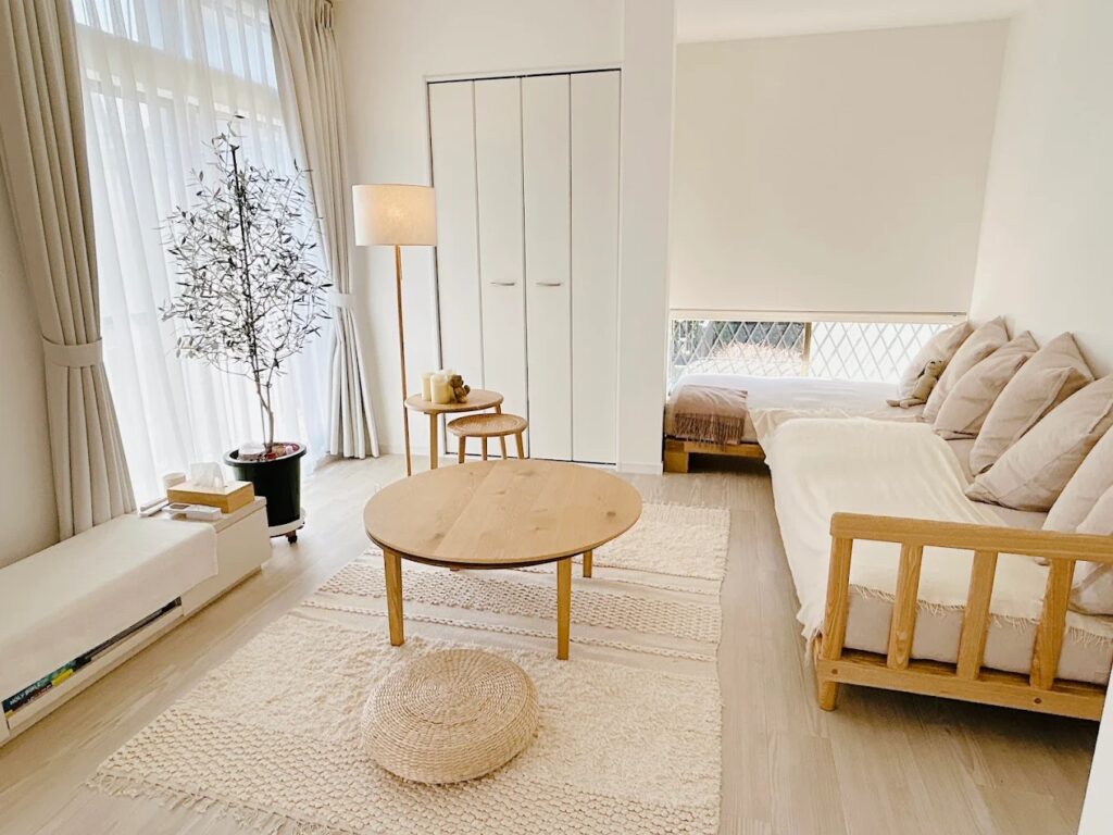 オリーブ色の家の中にある19畳の空間は広々としており、家具の配置も計算されていて撮影がしやすかったです😃
